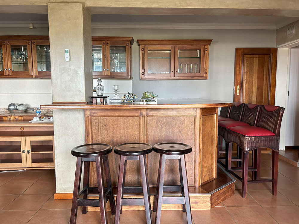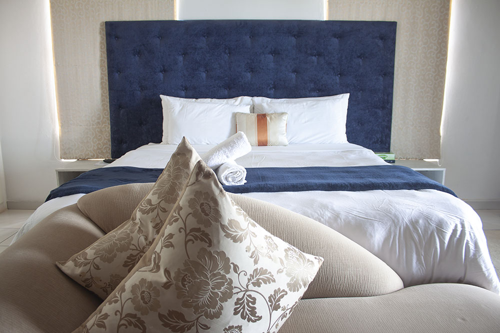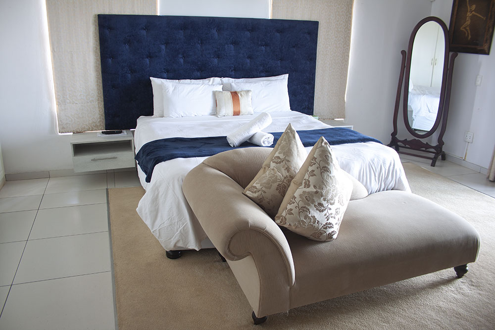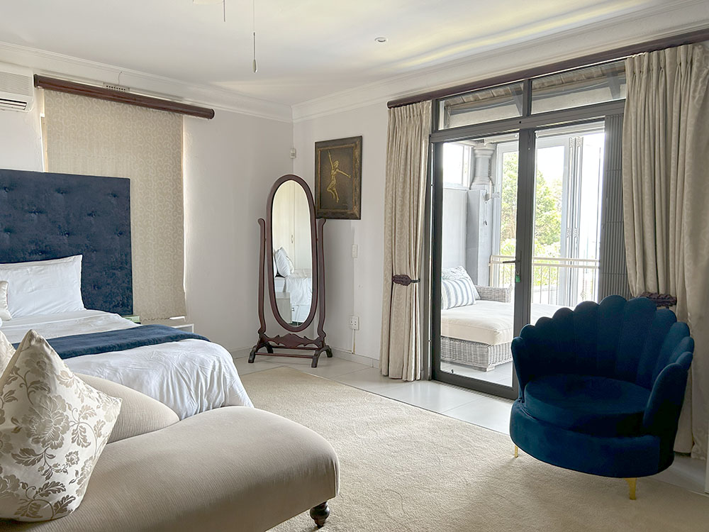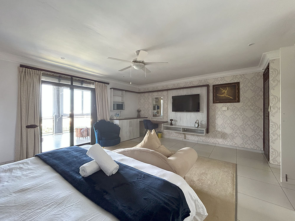 The luxury room has a king-size bed, large solid wood cabinetry with an executive desk, perfect for doing some work away from the home or office, with a sliding door that leads out to the patio. The en-suite bedroom has a shower and bath. There is a view of the garden and access to the swimming pool from the patio.