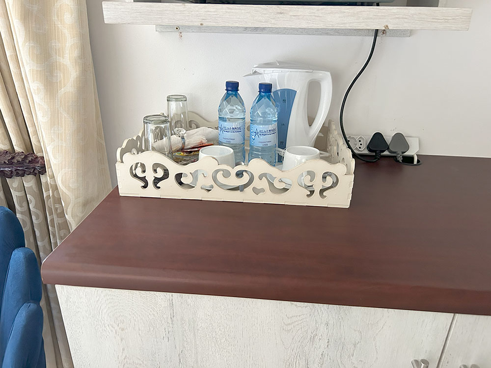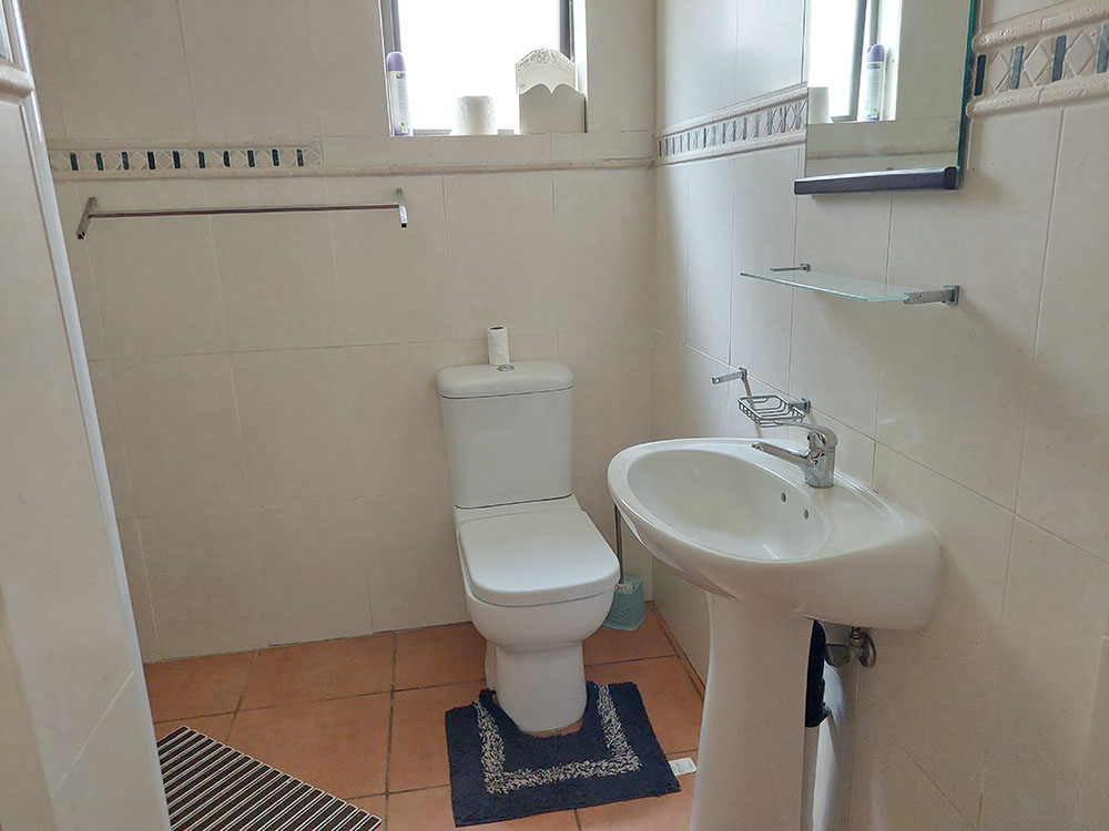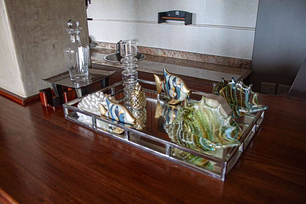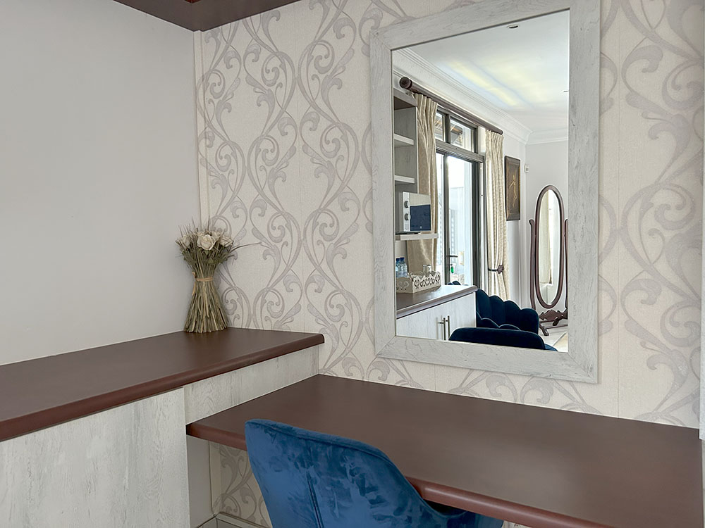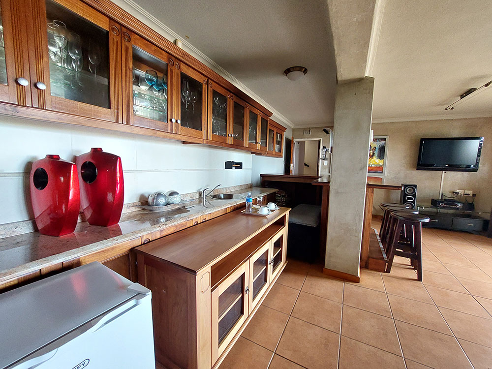 The luxury room has a king-size bed, large solid wood cabinetry with an executive desk, perfect for doing some work away from the home or office, with a sliding door that leads out to the patio. The en-suite bedroom has a shower and bath. There is a view of the garden and access to the swimming pool from the patio.
